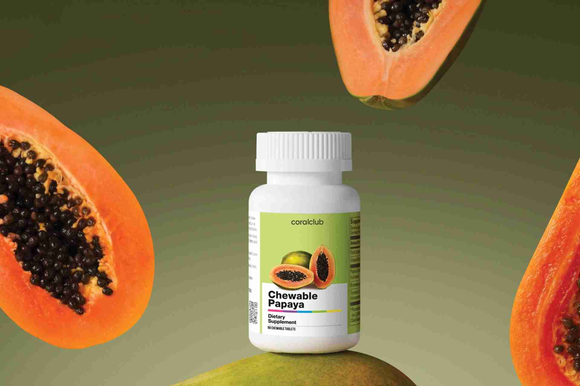Chewable Papaya ist ein Produkt auf Basis pflanzlicher Enzyme und Extrakte tropischer Pflanzen zur Unterstützung der Verdauung und Aufnahme proteinhaltiger Lebensmittel. Es kann dazu beitragen, die Verdauung von eiweißhaltigen Nahrungsmitteln zu fördern und dadurch das Unwohlsein nach den Mahlzeiten zu mindern. Bequeme Einnahme in Form von schmackhaften Kautabletten.