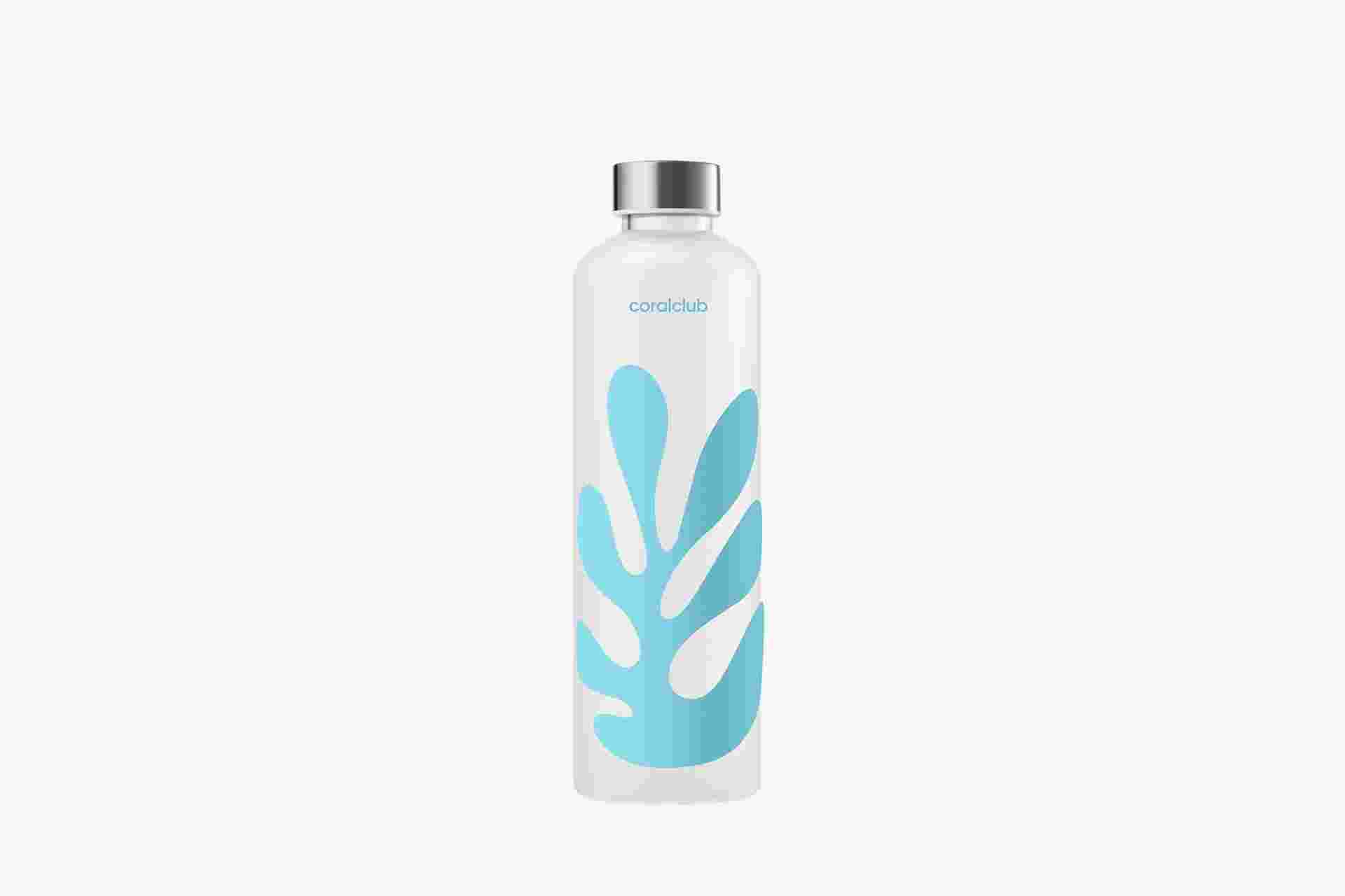 Eine Wasserflasche aus Borosilikatglas, die speziell zum 25-jährigen Jubiläum von Coral Club kreiert wurde.